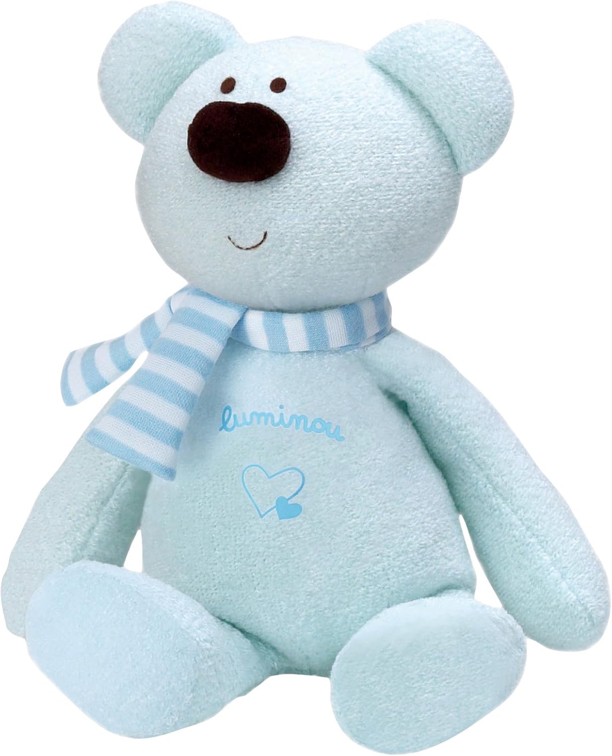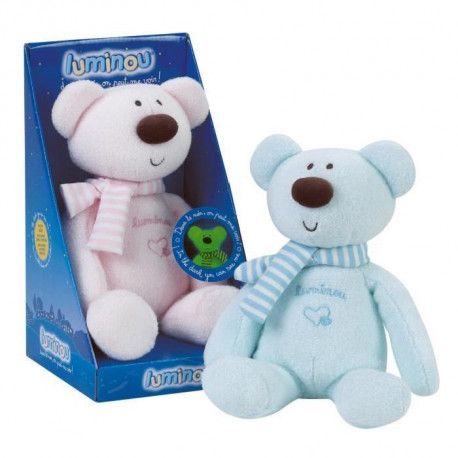Luminou ours clearance, doudou peluche LUMINOU JEMINI ours pyjama bleu rayé bonnet clearance