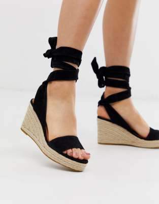 Espadrille talon noir clearance, Espadrilles à talons compensés en toile noire à rubans clearance