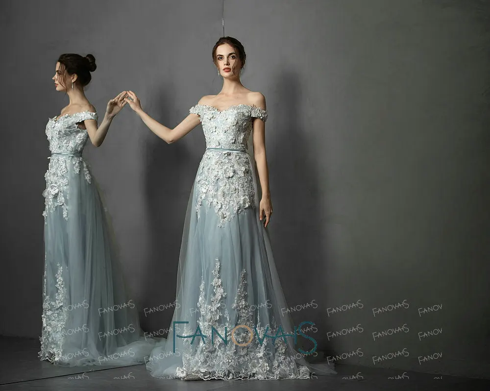 Robe de soirée avec traîne amovible clearance, Robe de soirée bleue à épaules dénudées, avec traîne amovible, à fleurs 3D, robe de bal, modèle 2019 | AliExpress clearance