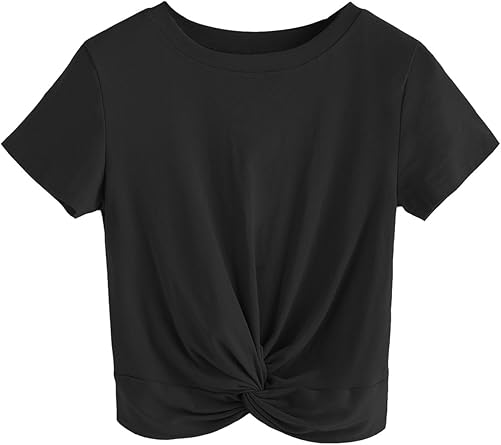 Top tee store clearance, Romwe Women's Tie Knot Front Cuffed Sleeve Crop Top Tee T-Shirt at Amazon Women's Clothing store clearance