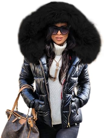 Black winter coat with fur hood clearance, Aox Women Winter Fox Faux Fur Shiny clearance