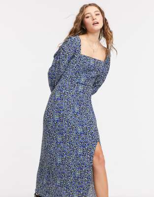 Robe avec fente bershka clearance, Bershka - Robe mi-longue à encolure carrée et imprimé floral - Bleu | Saluscampusdemadrid clearance