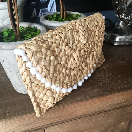 - Straw clutch with pom poms shop