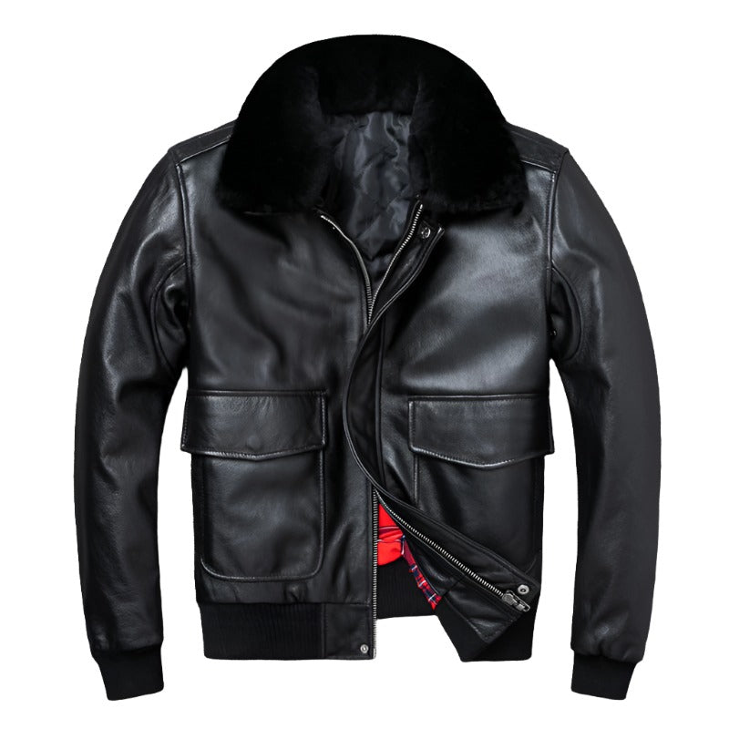 - Mens leather bomber jacket with fur collar