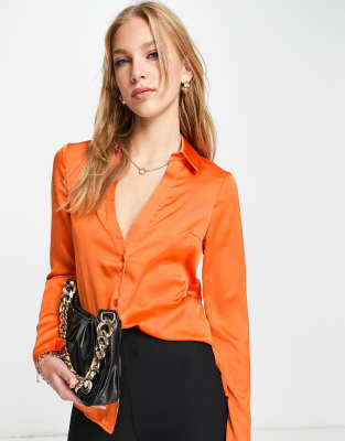 Satin orange shirt clearance, Topshop Fitted Long Sleeve Deep Cuff Satin Shirt in Orange clearance