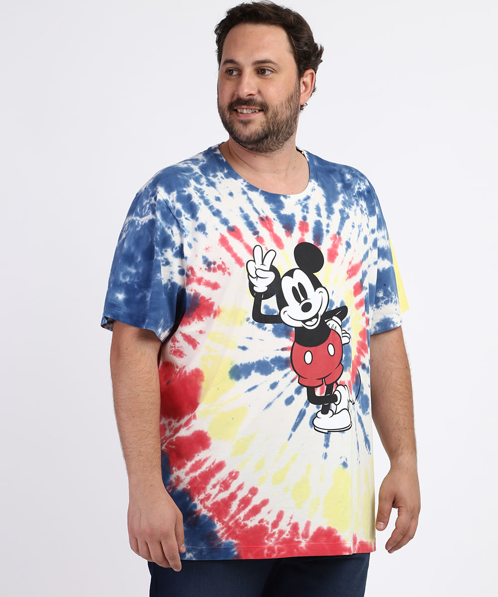 Camiseta tie dye masculina plus size clearance, Camiseta Masculina Plus Size Mickey Estampada Tie Dye Manga Curta Gola Careca Azul clearance