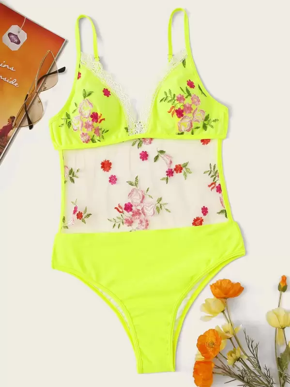 Mesh floral embroidered lace trim monokini clearance, Neon Yellow Mesh Floral Embroidered clearance