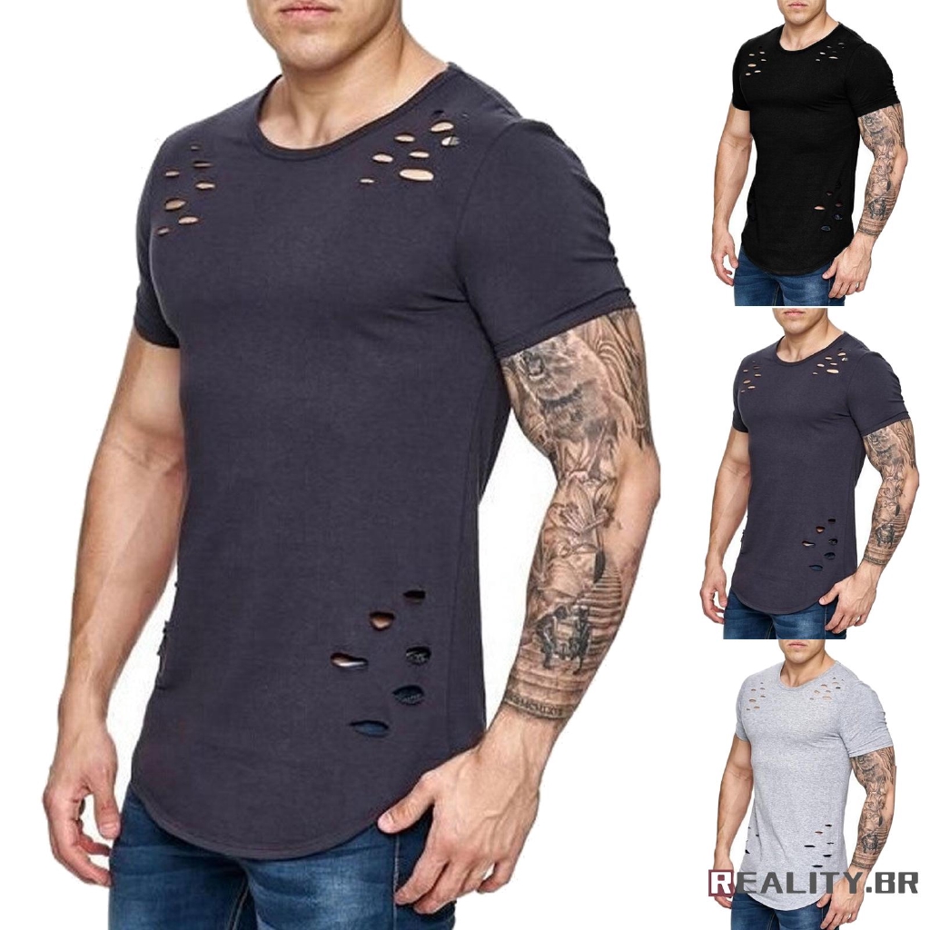 Camiseta rasgadinha masculina clearance, Camiseta de Manga Curta Rasgada com Gola Redonda / Camiseta Slim Fit/Masculina/Casual para Musculação | Shopee Brasil clearance
