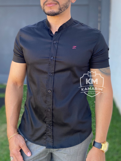 Camisa social manga curta gola padre clearance, Camisa Slim Preta Acetinada - Gola Padre - Zkn clearance