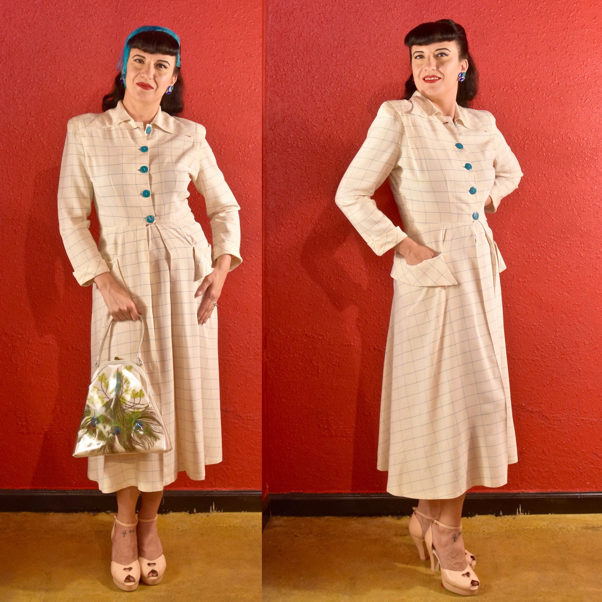 1940s shirtwaist dress clearance, 1940s Shirtwaist Dress White Plaid with Aqua \u0026 Pockets clearance