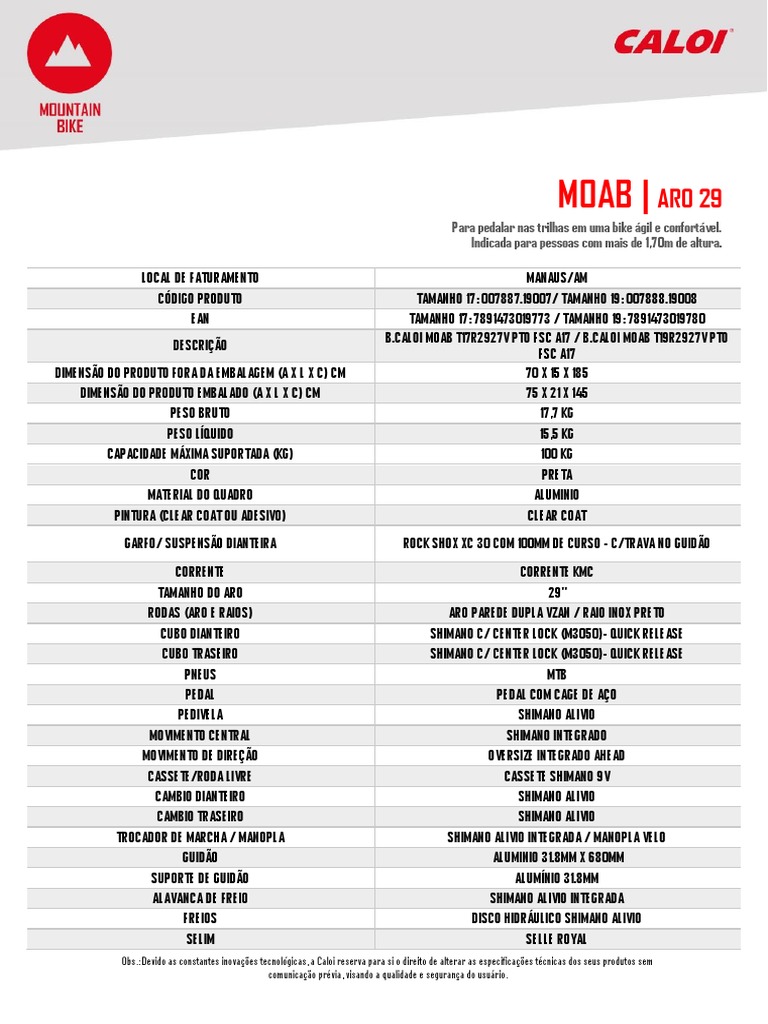 - Caloi moab 2020 ficha técnica clearance