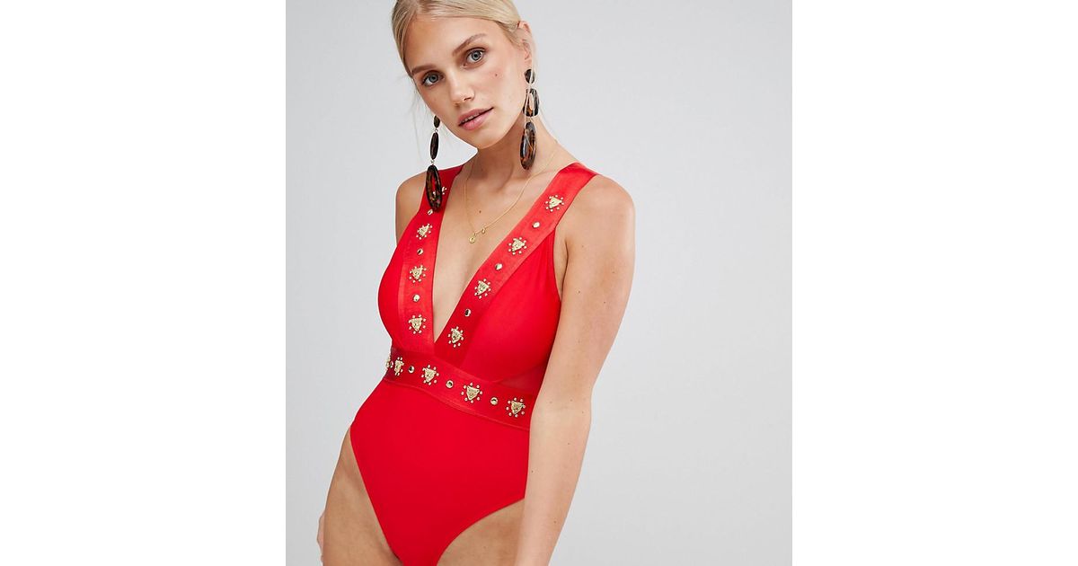 River island red swimsuit clearance, Red Rhinestone Plunge Swimsuit - Lyst clearance