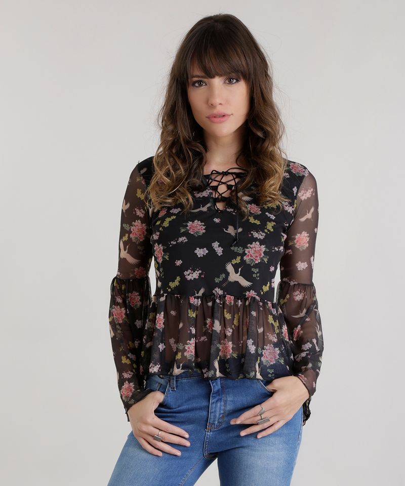 - Blusa em tule estampada floral preta shop