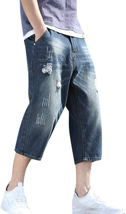 Vaqueros capri hombre clearance, Pantalones vaqueros rasgados de otoño para hombre, Capri con cinta en el tobillo, holgados, coreanos, harén, Vintage, Vaqueros rasgados para hombres / Vaqueros clearance