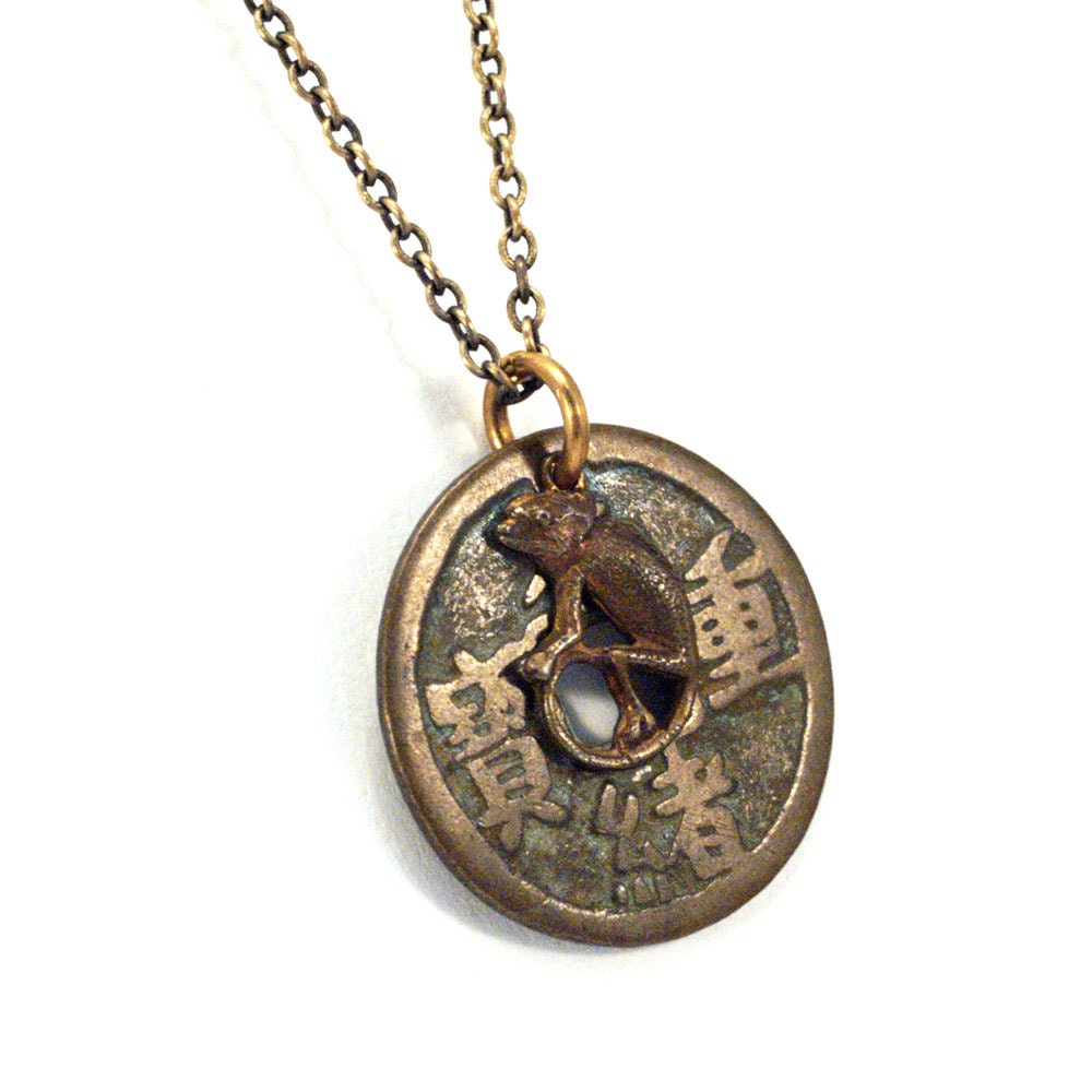 Chinese coin pendant clearance, Chinese coin necklace with vintage chameleon by AdornmentsNYC clearance