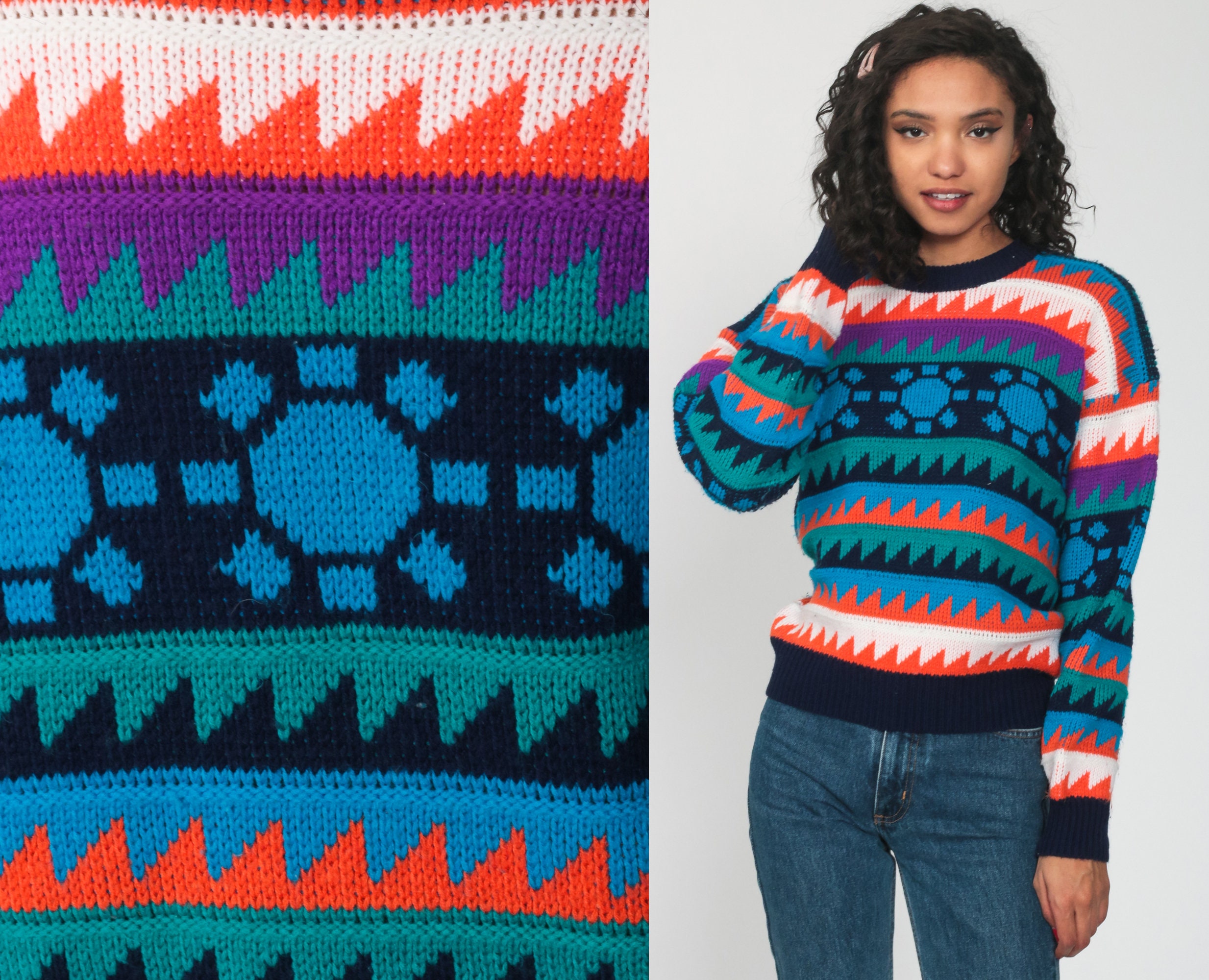 Neon color pullover clearance, Neon Geometric Sweater 80s Zig Zag Striped Sweater Knit Jumper 1980s Boho Vintage Pullover clearance