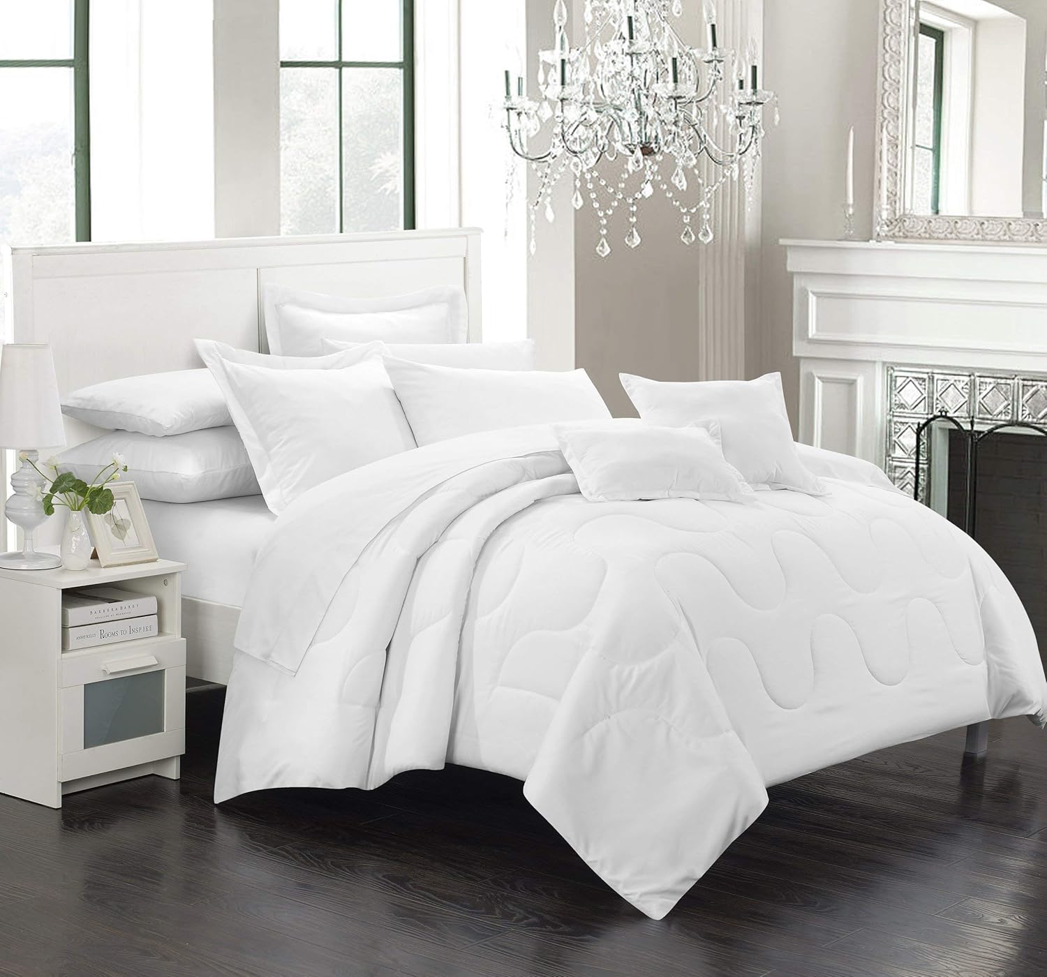 - Cheap White comforter with colorful pillows