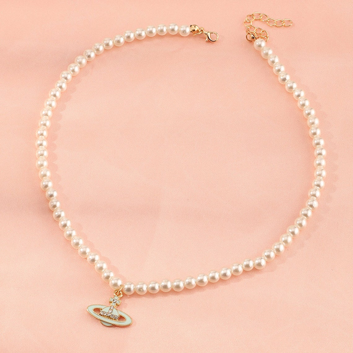Saturn pearl necklace real clearance, Pearl Necklace with Planet Saturn Turquoise Pendant Beaded | Etsy clearance