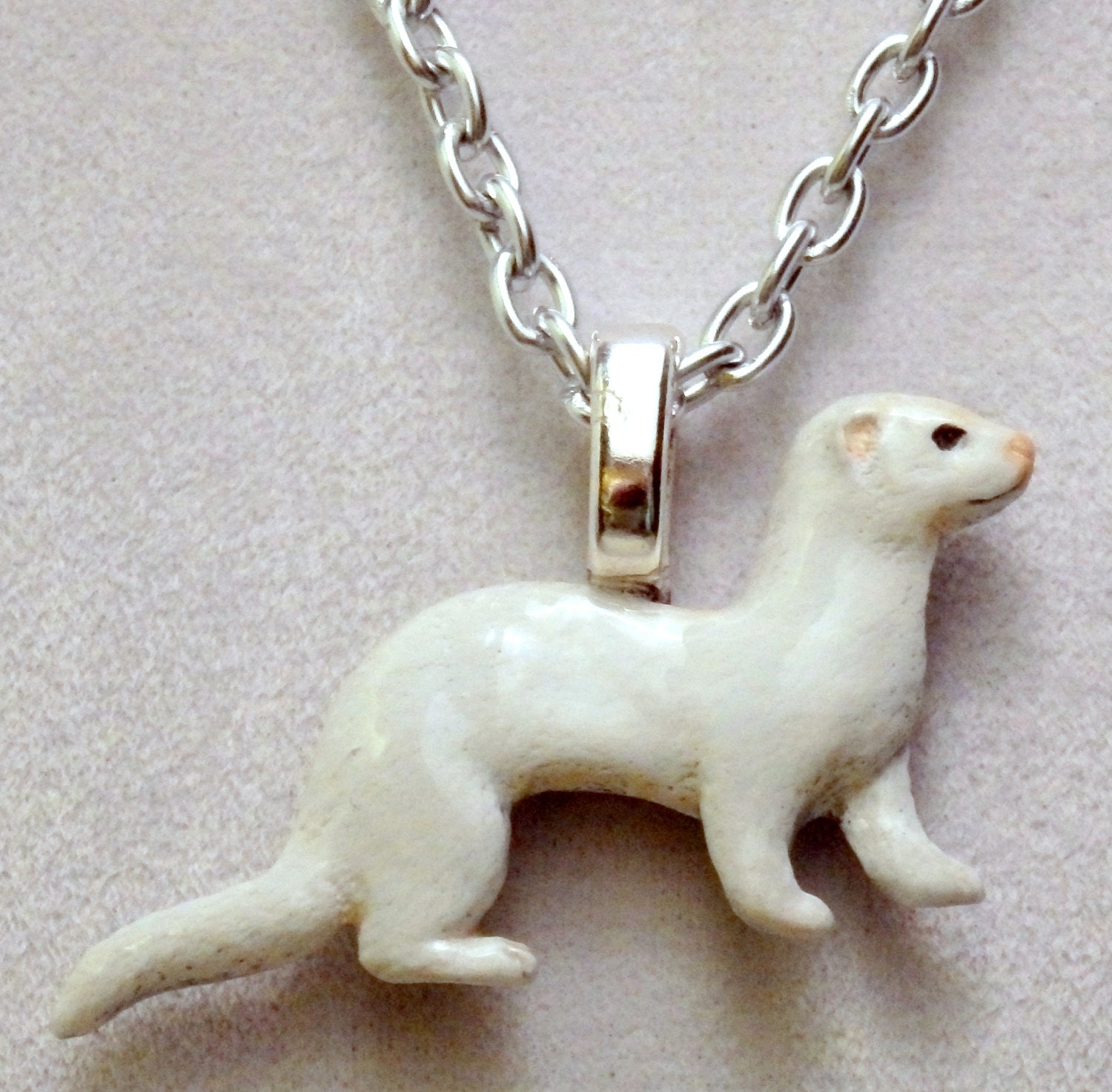 Ferret necklace clearance, Dark eyed white or DEW ferret necklace on 18 inch silver tone clearance