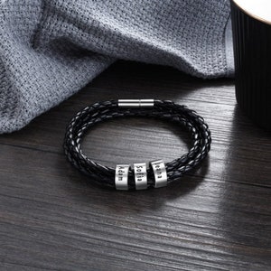 Leather bracelet with name beads clearance, Mens Leather Bracelets with 1-8 Engraved Beads Name, Custom Name Braid Bracelet Personalized Men clearance