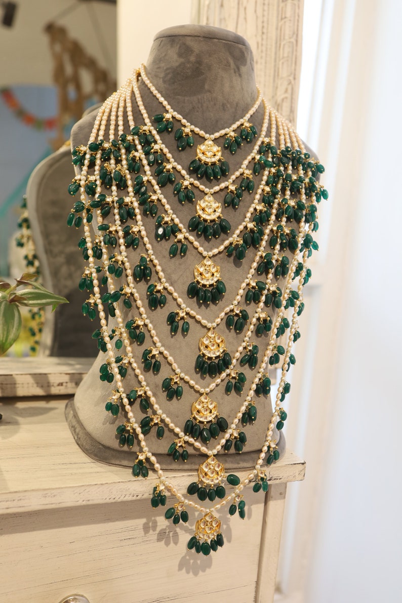 Satlada necklace gold clearance, 22K Gold '5 Lines' Long Necklace - 'Satlada Haar' with Culture Pearls, Cz & Color Stones - 235 clearance