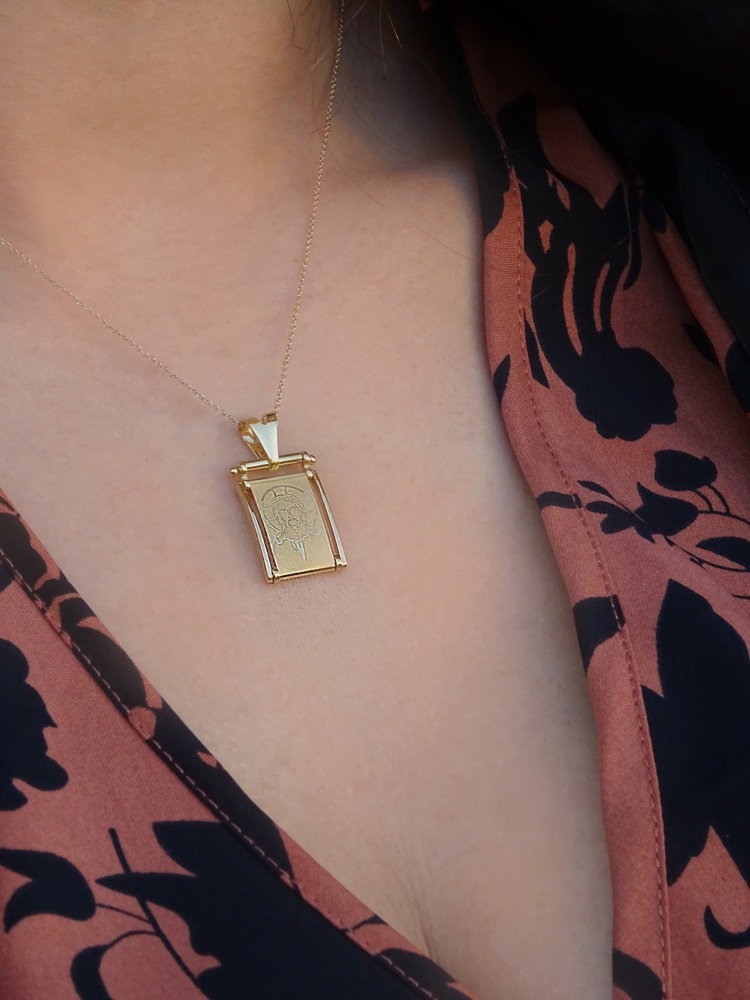 Gold protection necklace clearance, Solid Gold Jesus Pendant, Gold Protection Necklace 14K, Religious Gold Engraved Jesus Pendant clearance