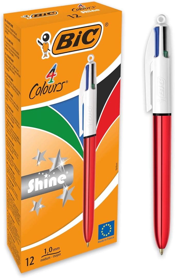 Four color pen clearance, BIC 4 Colours Shine Ballpoint Pens Medium Point (1.0 mm) - Metallic Red Barrel, Box of 12 clearance