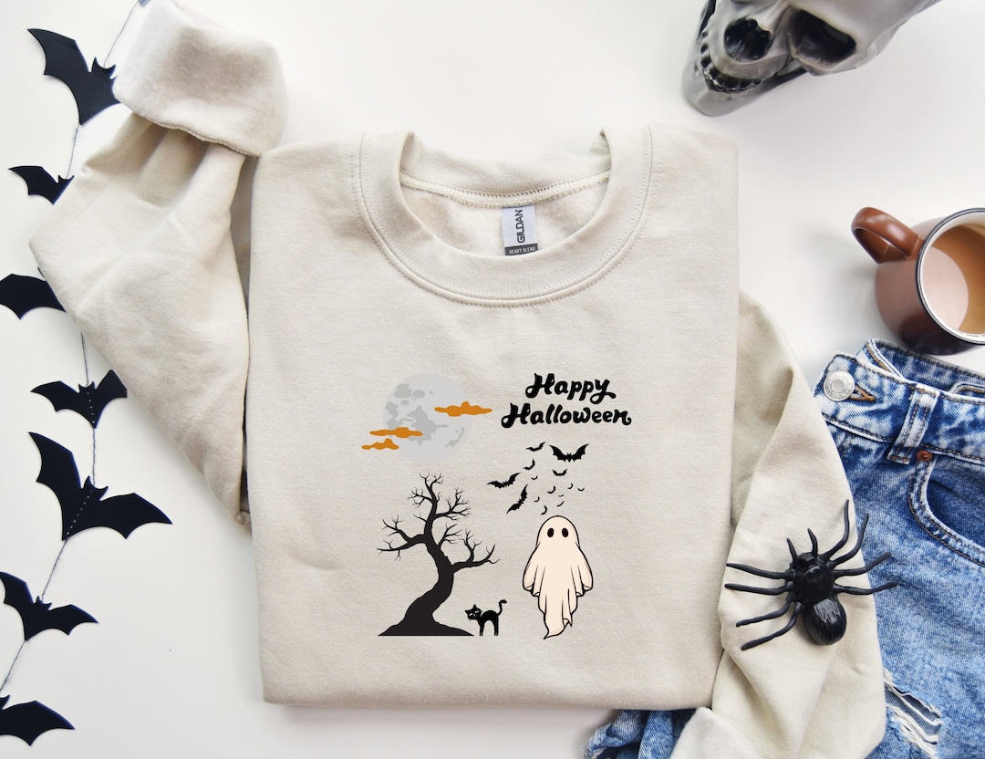 Halloween pullover clearance, Happy Halloween Pullover Sweatshirt, Fun Ghost and Black Cat Sweatshirt, Cozy Fall Sweatshirt clearance