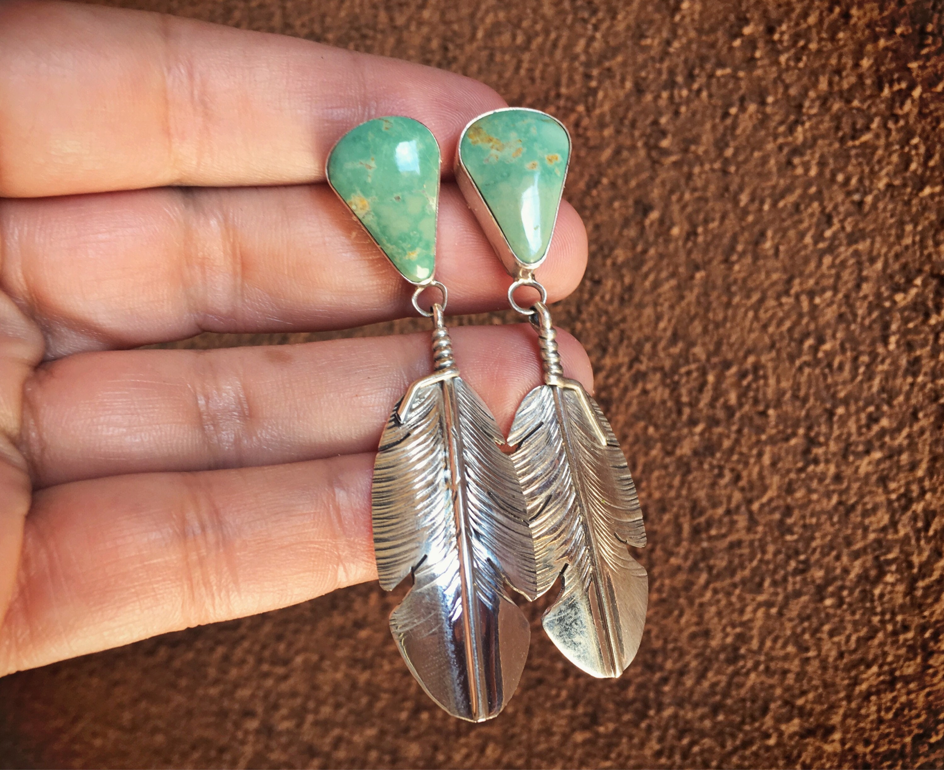 - Silver feather earrings with turquoise