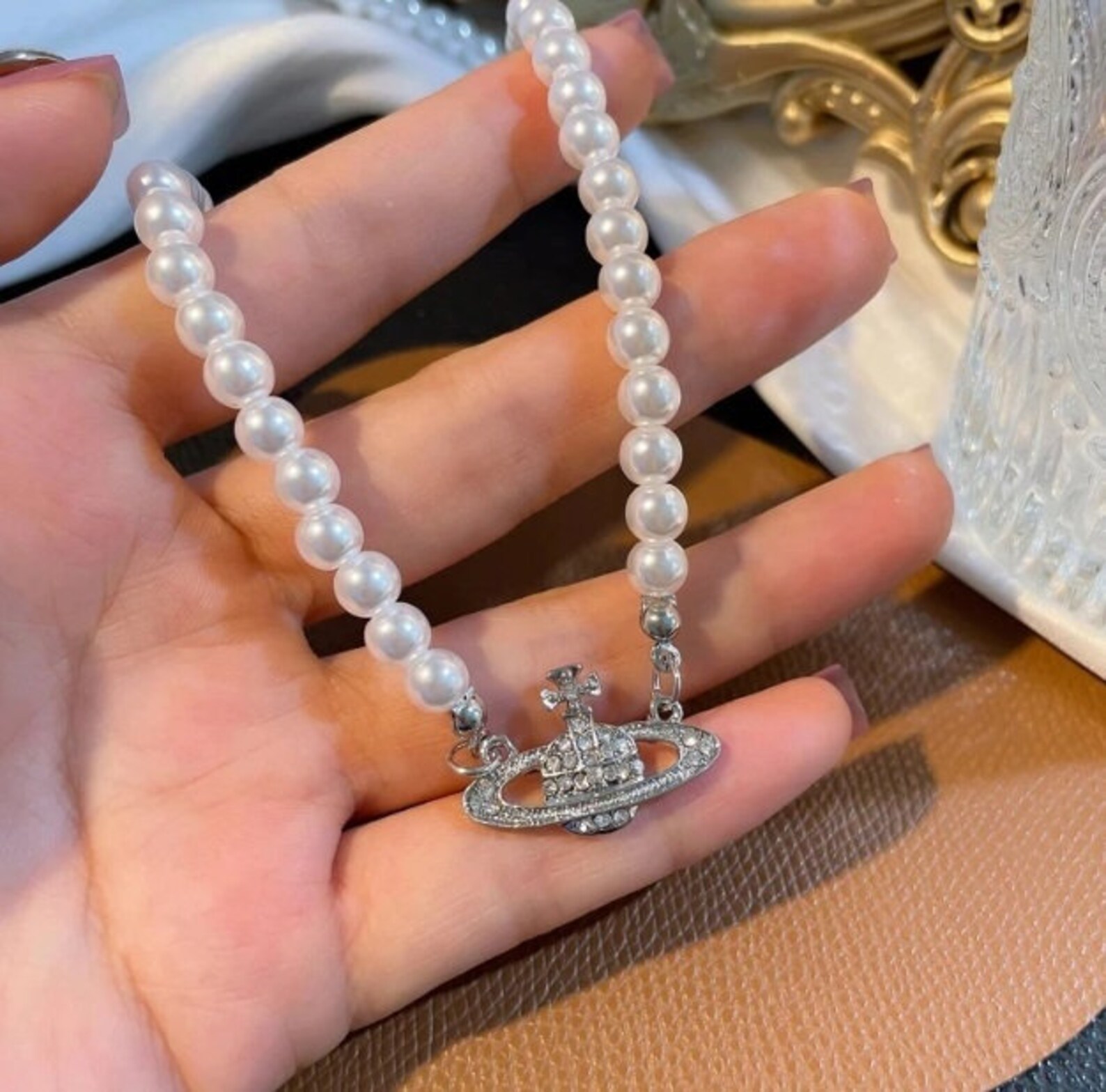 - Cheap Pearl choker with planet