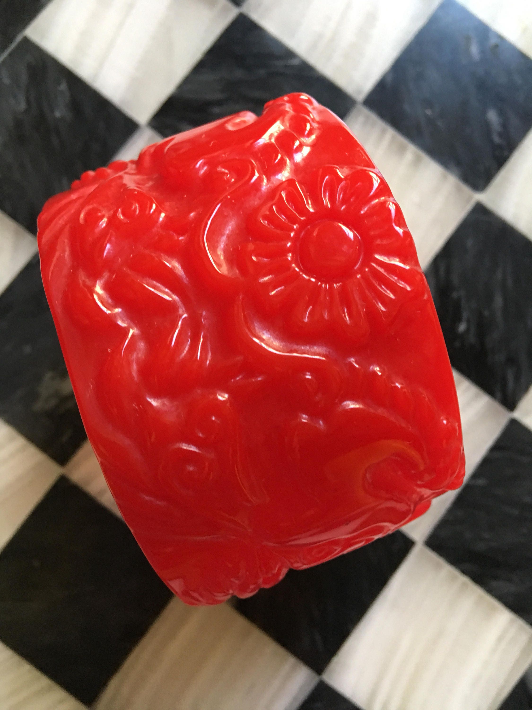 Red plastic bangle with gold clearance, Big Bold & Beautiful Red Plastic Bangle Bracelet with molded Hollywood Regency Floral design clearance