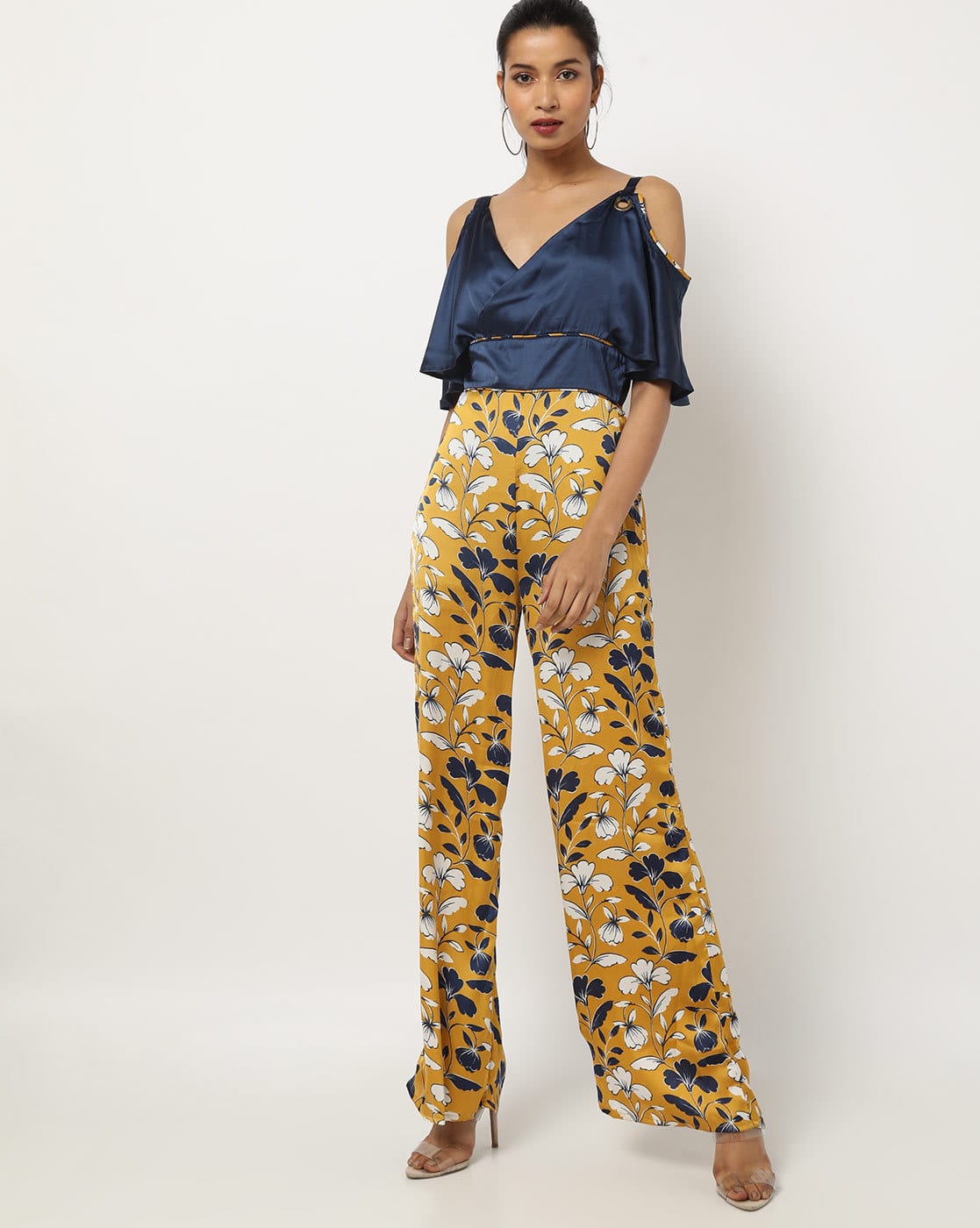 Blue and yellow jumpsuit clearance, Gold Victorian Plunge Palazzo Jumpsuit clearance