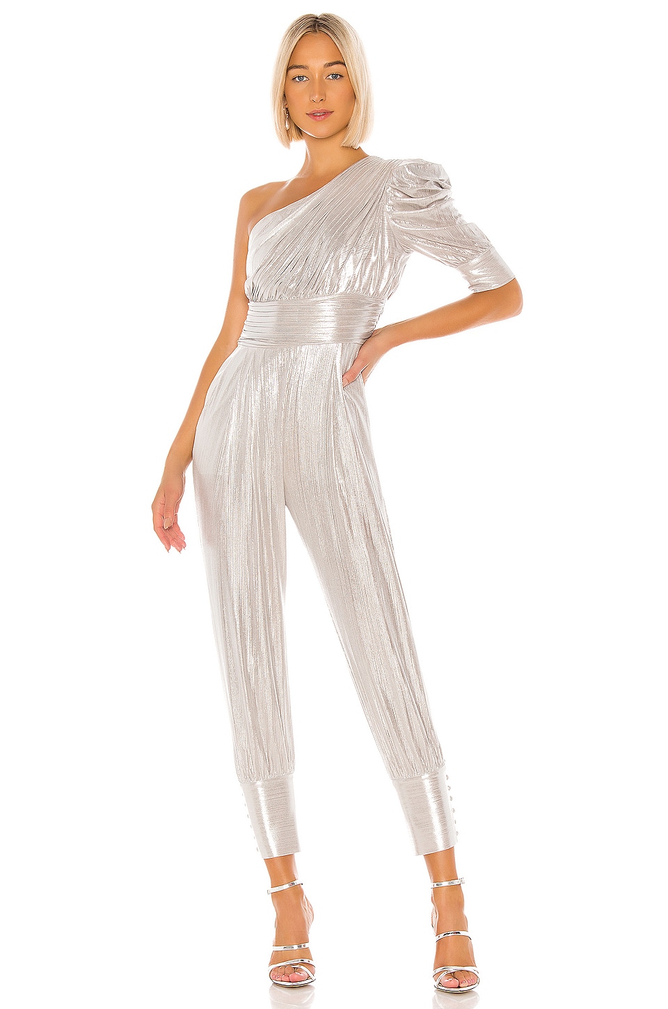 Silver all in one jumpsuit clearance, Cassandra One Shoulder Metallic Plisse clearance