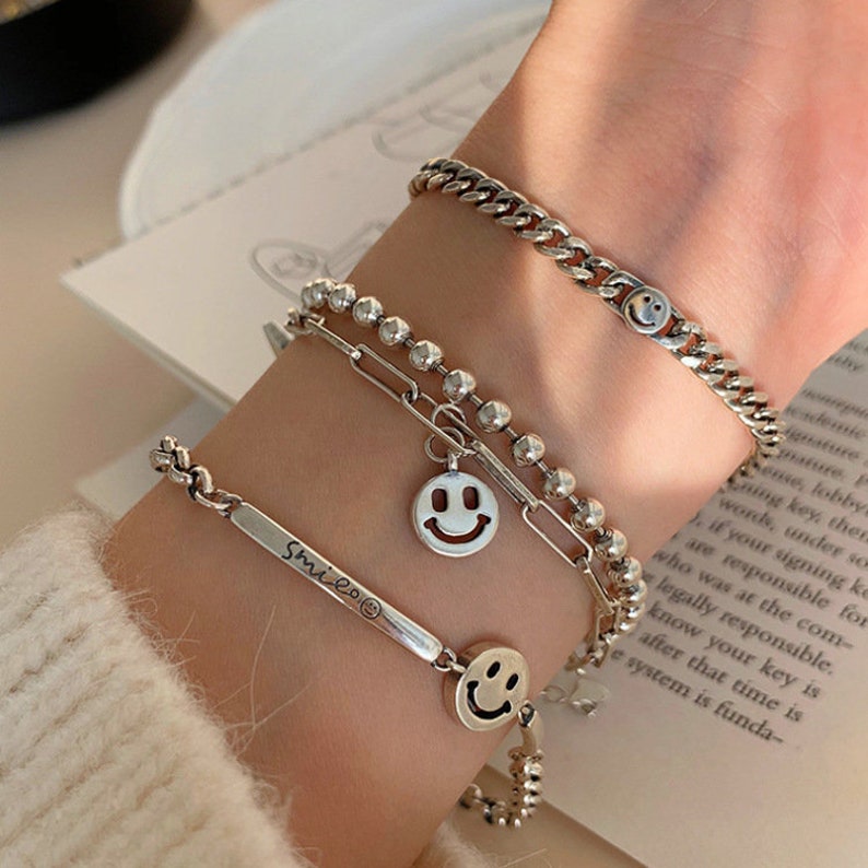 Smile chain bracelet clearance, Fashion smiley face round retro stitching chain wild doublelayer stainless steel bracelet for women clearance