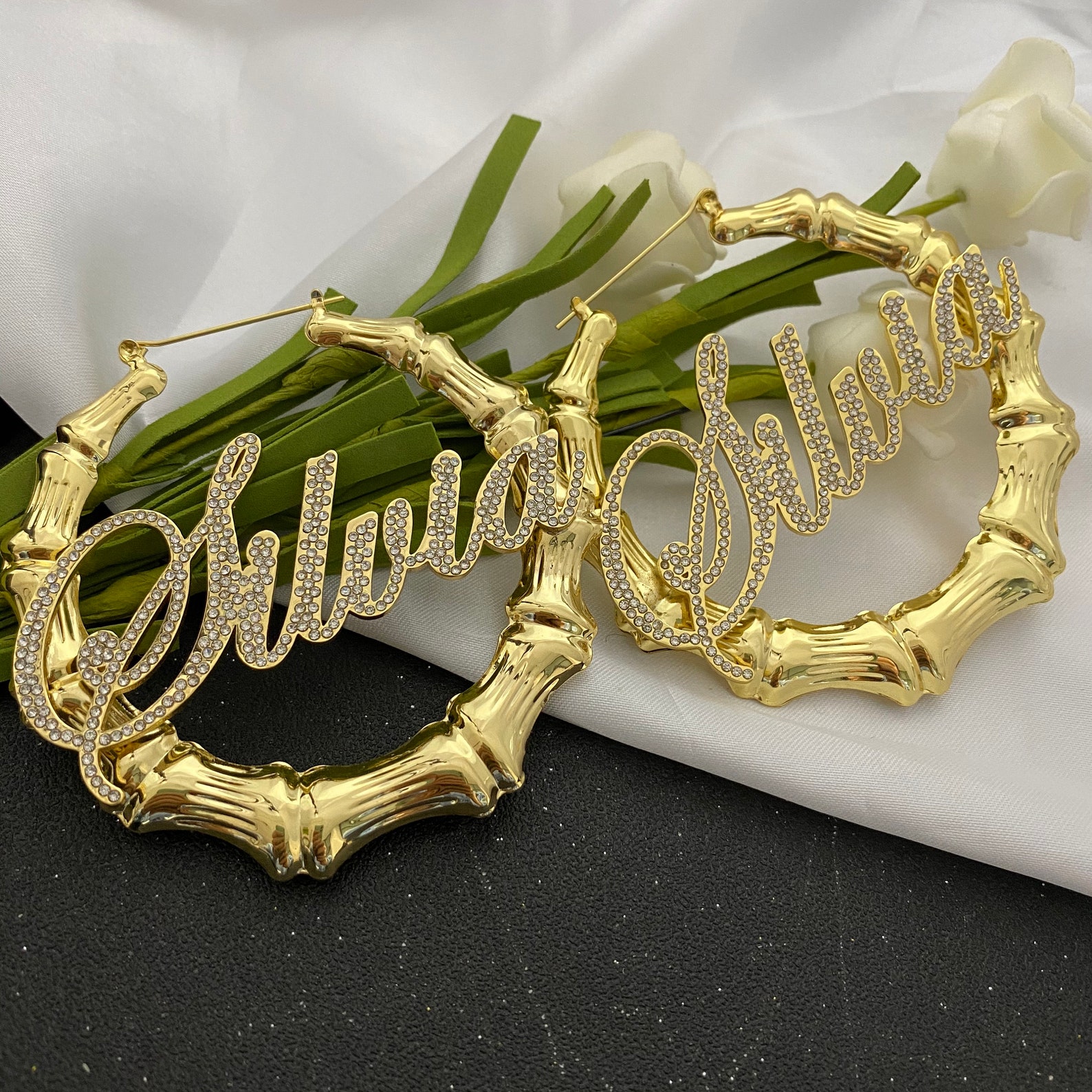 Bamboo earrings with words clearance, 24K Gold Plated Large Bamboo Name Hoop Earrings - Be Monogrammed clearance