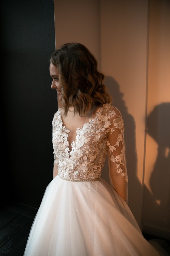 Vestidos de novia con flores 3d clearance, Vestido de novia tul Daffi con mangas clearance