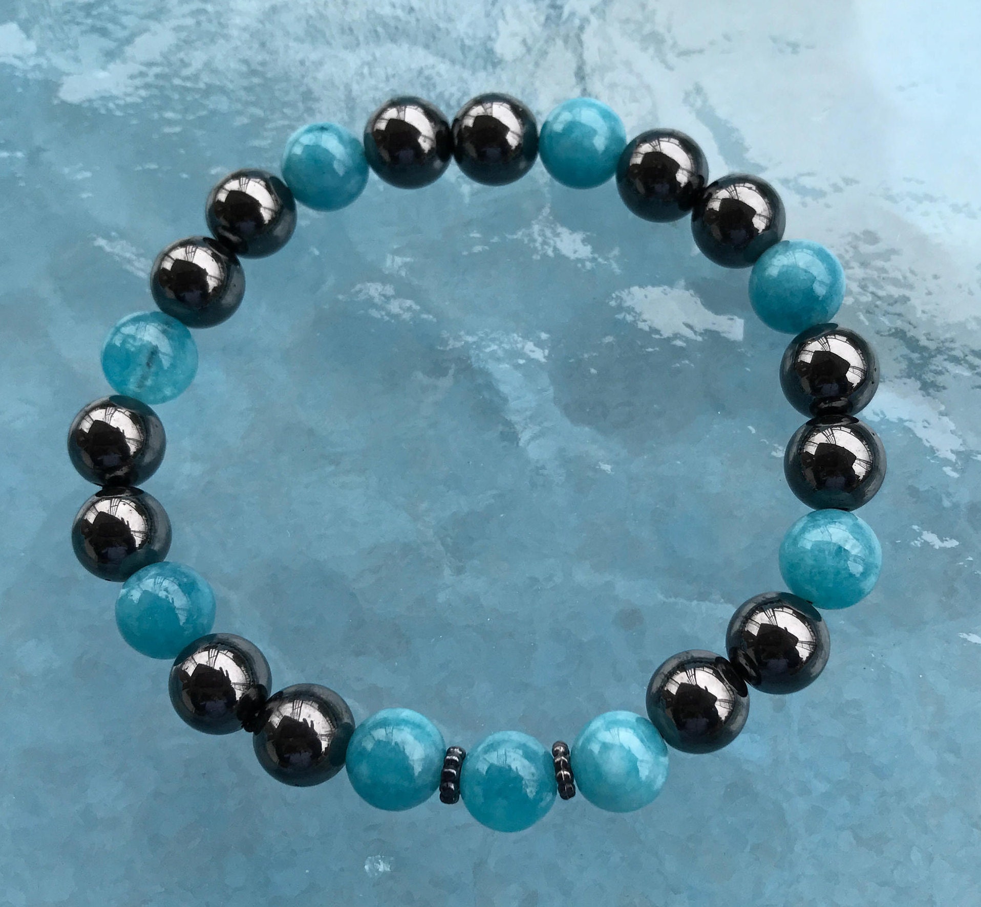Hematite bracelet clearance, 8 mm Genuine Hematite & Aquamarine Mala Beads Bracelet, Energized Hematite Healing Bracelet clearance
