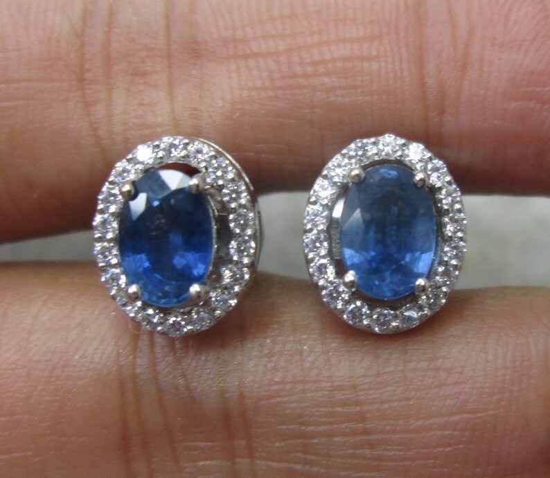 Diamond and blue sapphire earrings clearance, Blue Sapphire Diamond Stud Earrings with Diamond Halo 18k White Gold Screw Back For Sale at 1stDibs clearance