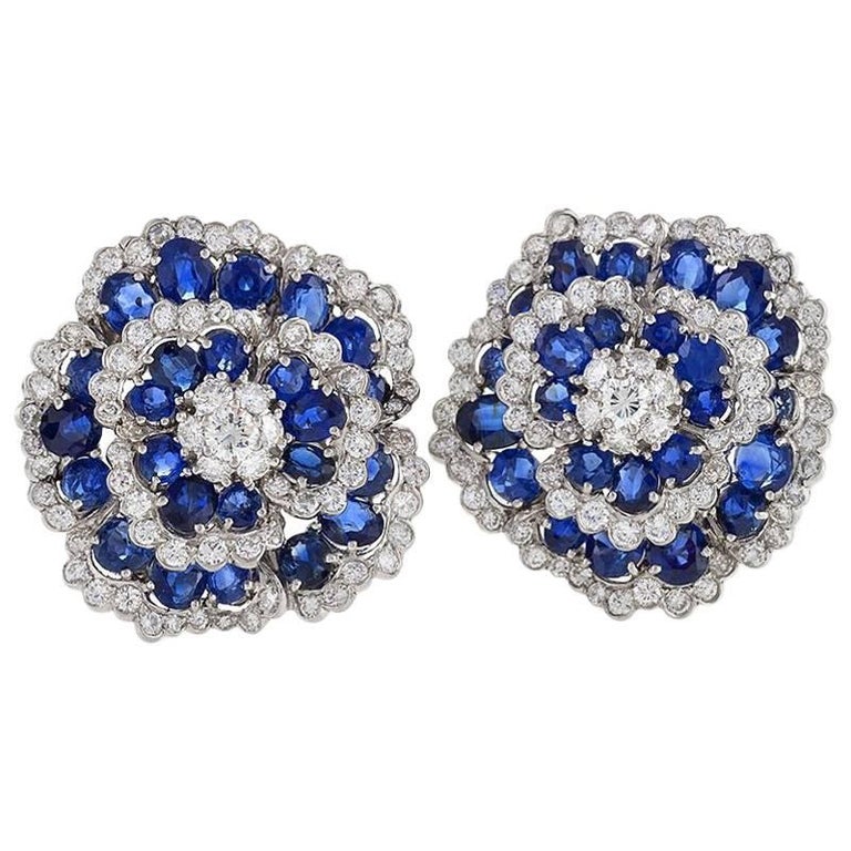 Van cleef and arpels clip on earrings clearance, Van Cleef and Arpels Blue Sapphire Diamond Platinum Camellia Clip-on Earrings For Sale at 1stdibs clearance