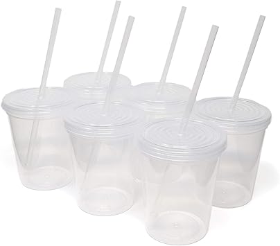 - White plastic cups with lids and straws