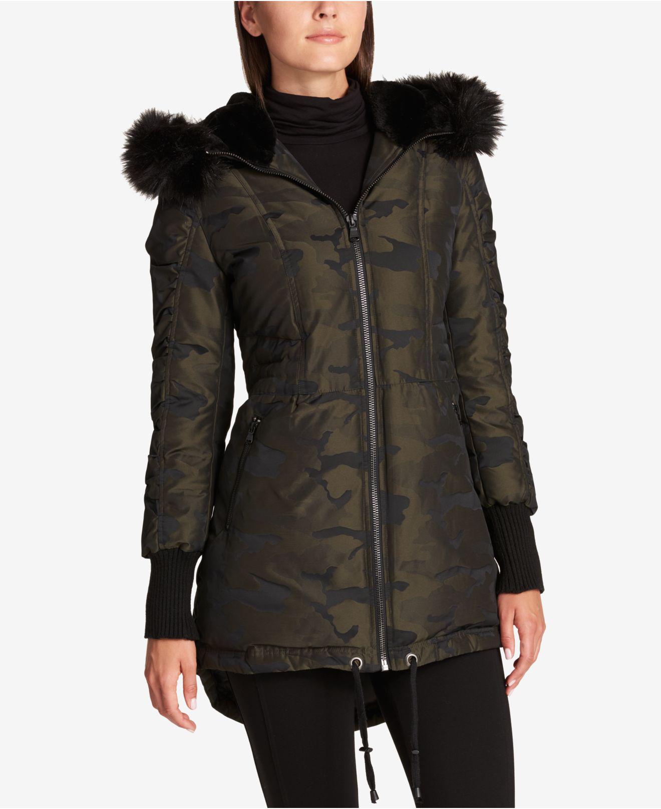 Dkny camo puffer coat clearance, DKNY Faux Fur Trim Camo Print Puffer clearance