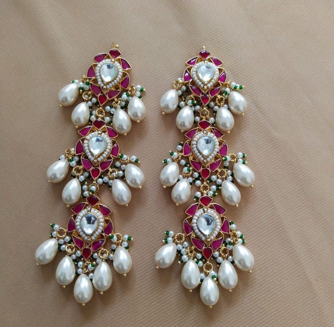 Kundan long earrings clearance, Kundan Earrings, Gold Plated Fashion Earring,long Dangler Earring,pink and Pearl Drop Earrings clearance