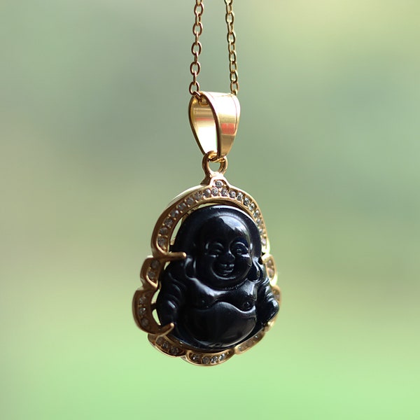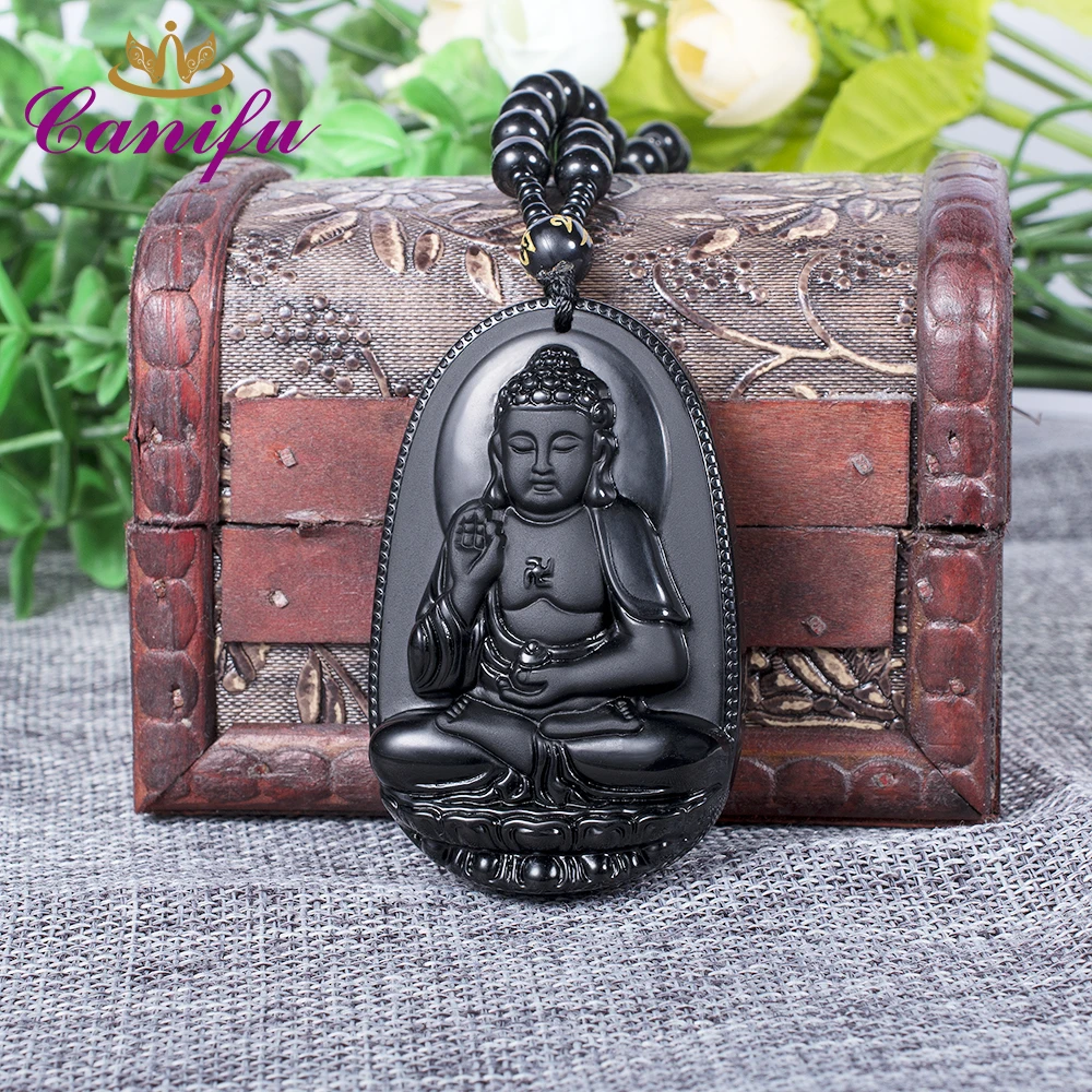 Black buddha chain clearance, Canifu Big Unique Natural Black Obsidian Carved Chain Buddha Pendant Lucky Amulet Necklace clearance