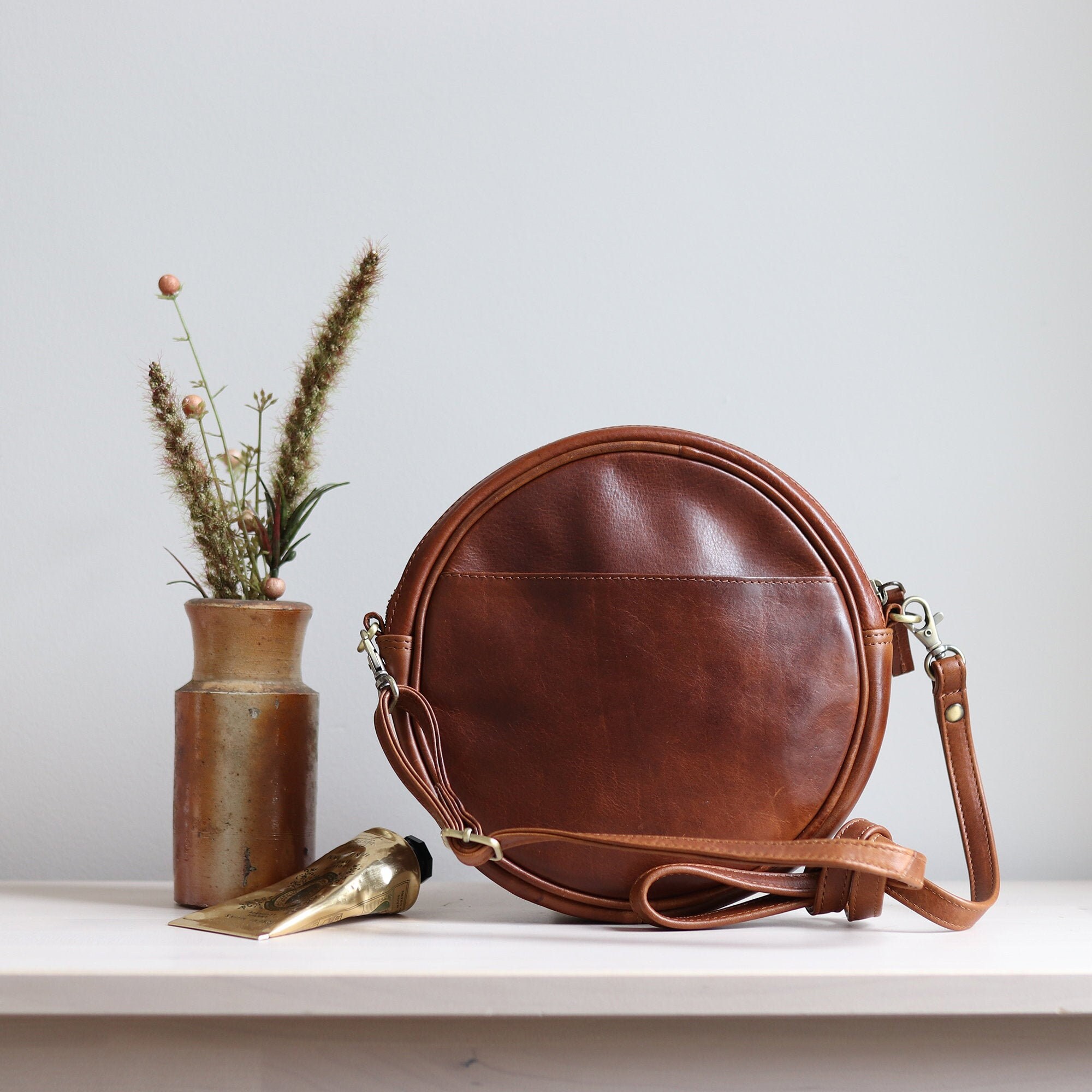 Round tan bag clearance, Round Leather Bag Crossbody Bag Tan clearance