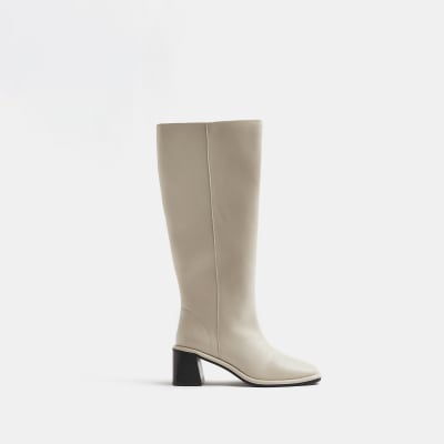 - Cream block heel knee high boots