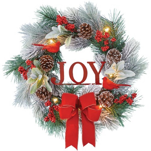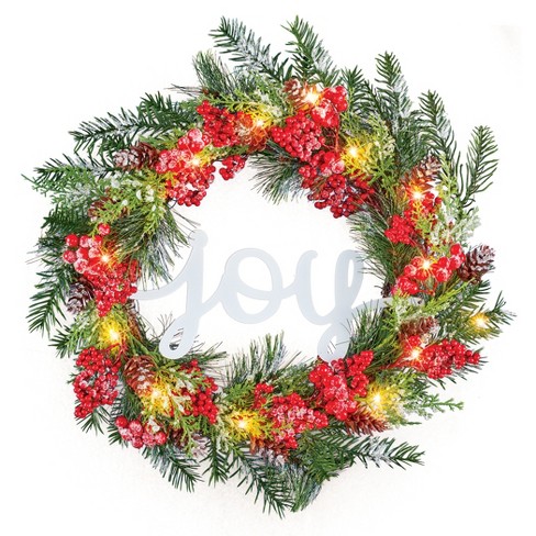 Joy christmas wreath target clearance, Collections Etc Led Lighted Frosted Pine Branches And Red Berries 'joy' Wreath : Target clearance