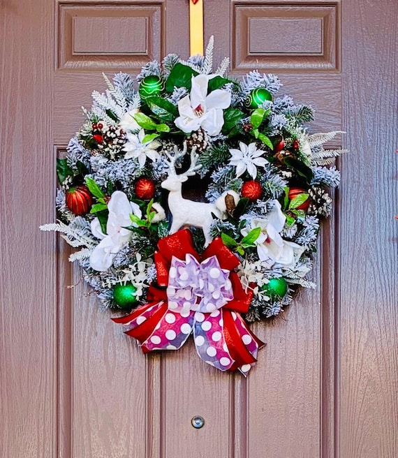 Christmas wreath with reindeer clearance, Artificial Christmas Wreath, Christmas Wreaths for Front Door, Hanging Wreath with A Deer in the Middle, Decorated with Flocked Branches, Red White Christmas Door Wreath Decor with Balls(55cm) : Amazon.co.uk: Home u0026 clearance