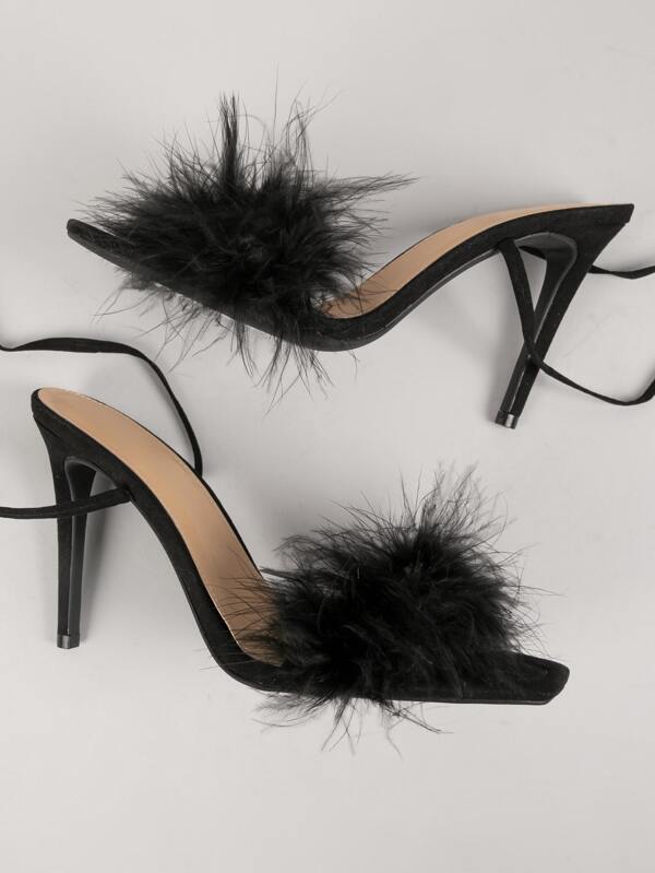 Fluffy open toe heels clearance, Tie Leg Design Stiletto Heeled Fluffy Strappy Sandals, US6.5 Black Plain Stiletto Ultra High Heel Glamorous Suedette Lace Up clearance