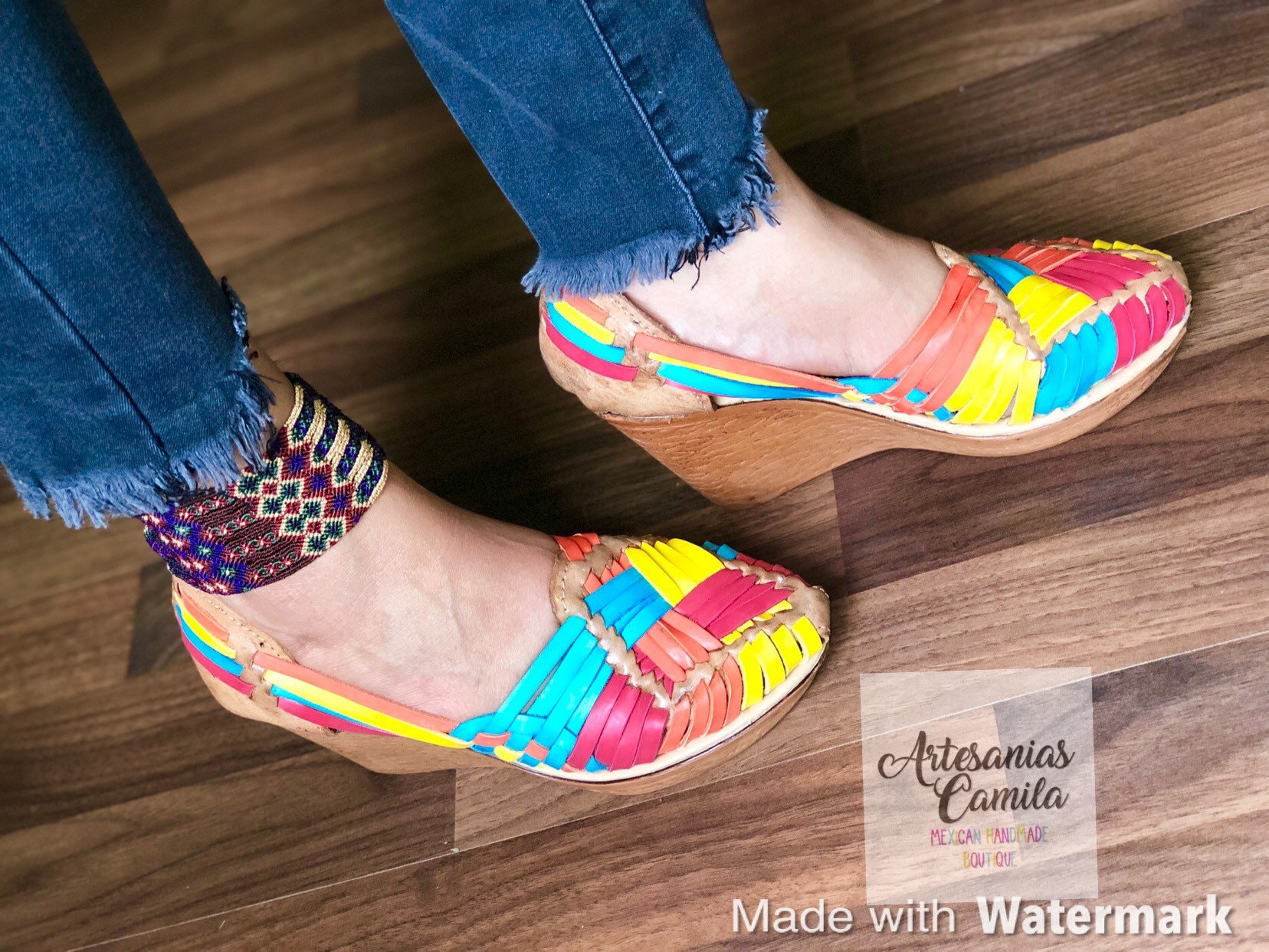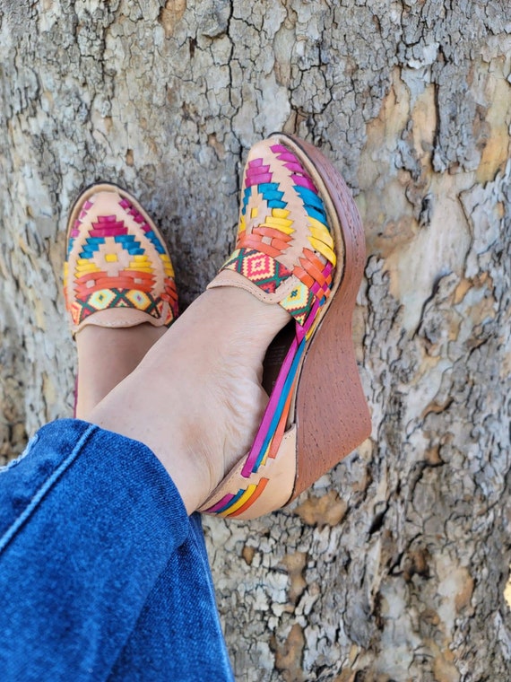 High heel huarache sandals clearance, Leather Embroidered Mexican High Heel Huarache - Mexican Style Boho Hippie All Sizes- 5-10 Shoe Wedges Embroidered Floral clearance