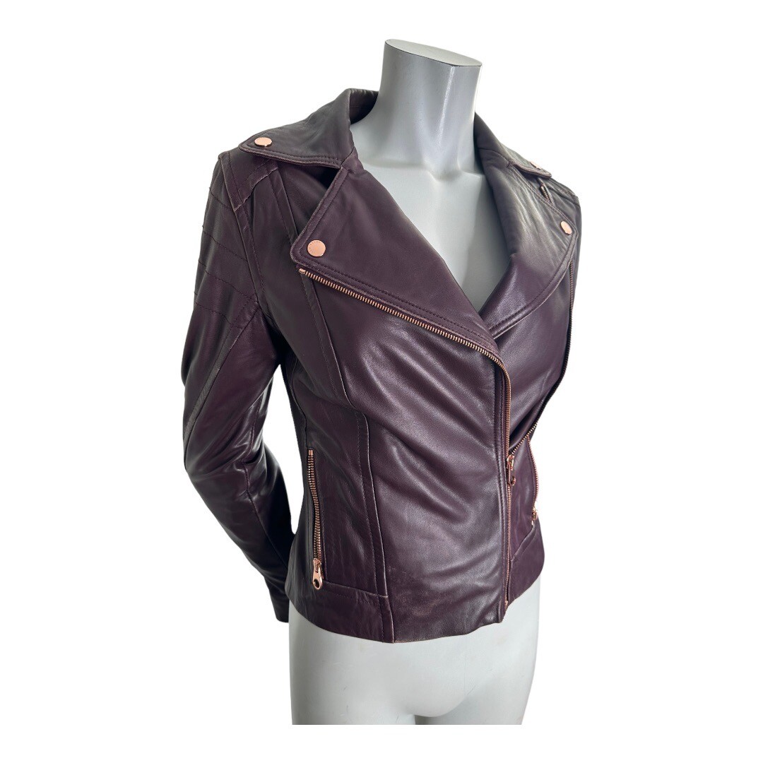 Ted baker leather jacket rose gold zip clearance, Ted Baker Womens Burgundy Leather Rose Gold Zipper Moto Jacket Size 0 fits US XS | eBay clearance